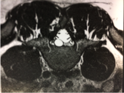 Dans ce cas précis, l’histoire s’est compliquée par l’apparition ultérieure d’une pathologie de compression d’une racine nerveuse par un kyste neural, ce qui est une pathologie assez rare comparée à la fréquence des hernies discales exclues.