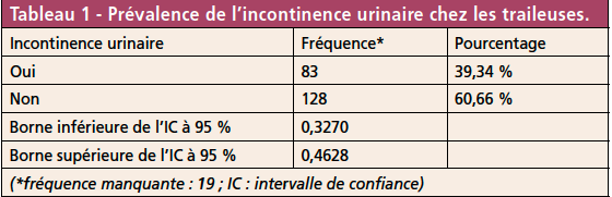 Le taux de participation à l’étude a été de 33,6 %, soit 230 réponses exploitables (Fig. 3). La prévalence de l’incontinence urinaire dans cette population a été de 39,34 %, IC 95 % (32,70-46,28) (Tab. 1).