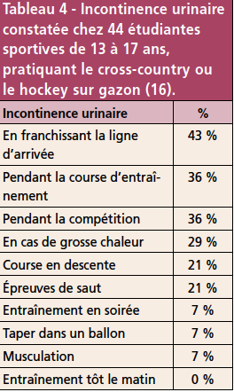 La prévalence observée d’incontinence urinaire chez les traileuses de la Réunion a été proche de celles retrouvées dans d’autres études sur les sportives de haut niveau pratiquant des disciplines variées, où la prévalence de l’incontinence urinaire variait entre 14 et 80 % (moyenne de 33,69 %) (2-8). De même, elle a été supérieure à celle de la course à pied (30 %), dans une population de marathoniennes (9). Ce phénomène d’incontinence urinaire a été constaté chez les femmes sportives, quels que soient l’âge et le sport (10, 11) et sa prévalence augmente avec la difficulté du sport (12). Il a été remarqué dans des sports très divers : gymnastique (13), saut à la corde (14), au trampoline (15), course à pied, avec une incontinence plus marquée en fin d’épreuve (16) (Tab. 4). Chez certaines athlètes, cette incontinence urinaire a été constatée dans 61 % des cas à l’entraînement et dans seulement 45 % des cas en compétition (17). S’y ajoute parfois un dysfonctionnement sexuel (17, 18).