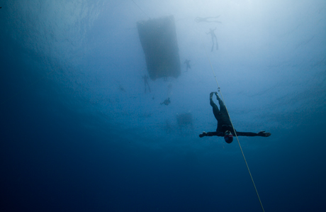 Si l’apnée est avant tout une expérience personnelle et intime, pratiquée en compétition, elle est aussi l’occasion de se confronter aux autres et de dépasser ses limites. La performance est liée à la profondeur maximale atteinte en mer. La profondeur choisie est annoncée par chaque apnéiste la veille de la compétition, à bulletin secret. Avant le début du championnat, on a donc déjà une idée du podium, en fonction de ce que chaque compétiteur a annoncé. « Mais encore faut-il réaliser son annonce, déclare Morgan Bourc’his. Et bien souvent, ça ne se passe pas comme prévu ! » L’annonce est tactique. Vaut-il mieux choisir une profondeur confortable et réalisable ou bien prendre des risques et tenter de dépasser ses limites ? Tout dépend de la forme et de l’état de confiance de l’apnéiste au moment de la compétition. « Le jour où j’ai annoncé 90 mètres, mon record à ce jour, je savais que j’allais au-delà de mes limites… » témoigne Morgan, qui n’avait encore jamais atteint une telle profondeur à l’entraînement.
