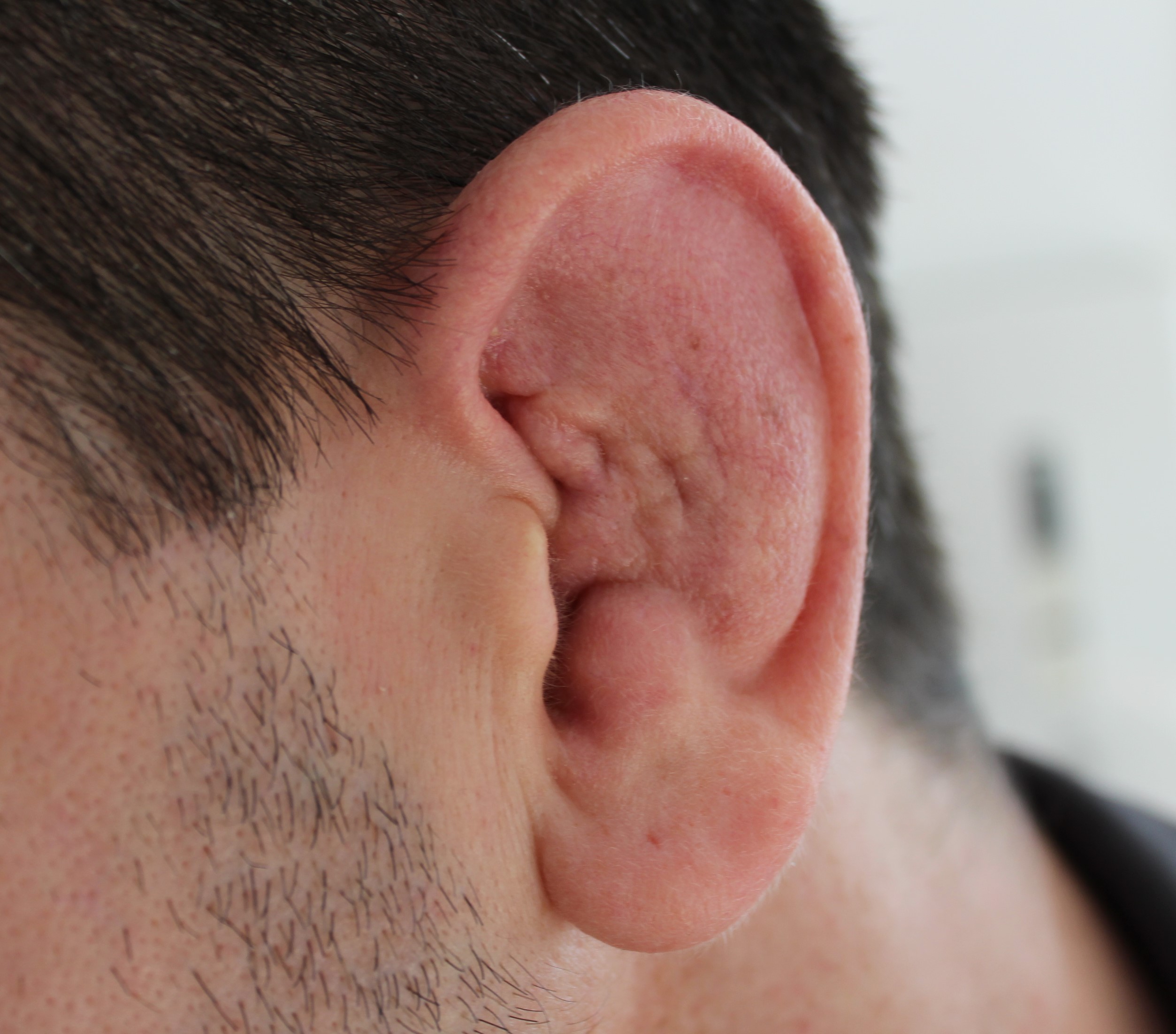 - Par ailleurs, certains sportifs négligent de traiter ce type d’hématome, ce qui conduit à moyen ou long terme à objectiver une modification morphologique des oreilles (le plus souvent chez ces sportifs l’atteinte est bilatérale) en chou-fleur, qui est la résultante d’une nécrose avasculaire du cartilage de l’oreille (Fig. 2). Sur cette zone plusieurs fois traumatisée se développe un néocartilage provenant d’une accumulation de chondroblastes. Outre les conséquences esthétiques induites par ce remodelage, cette situation peut conduire à des problèmes de surdité ou d’obstruction du conduit auditif par du cérumen de manière répétée. Ces problématiques sont la conséquence d’une réduction du calibre du conduit auditif externe. Dans ce cas de figure, la seule issue est la correction chirurgicale (excision du néocartilage, recours à des lambeaux cutanés, autogreffe de cartilage).