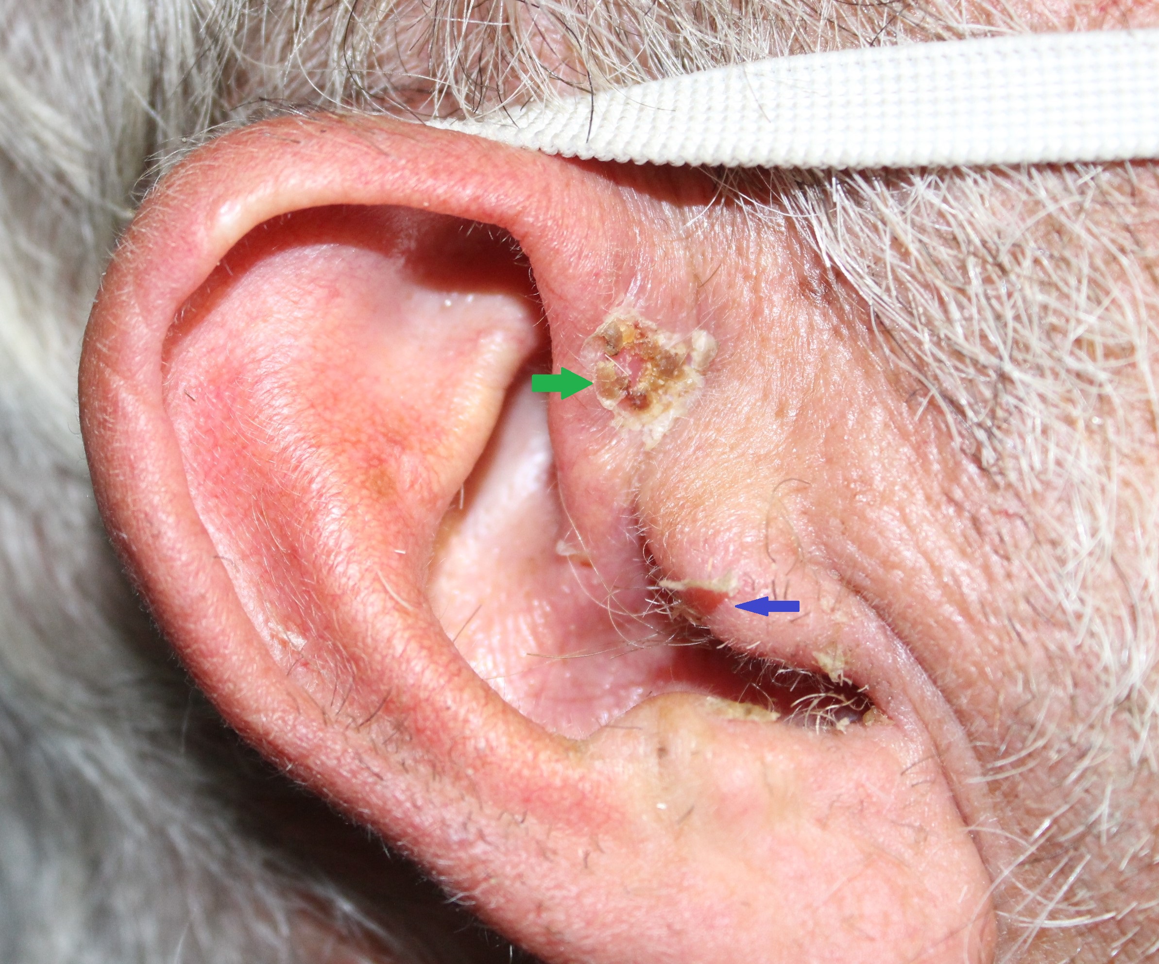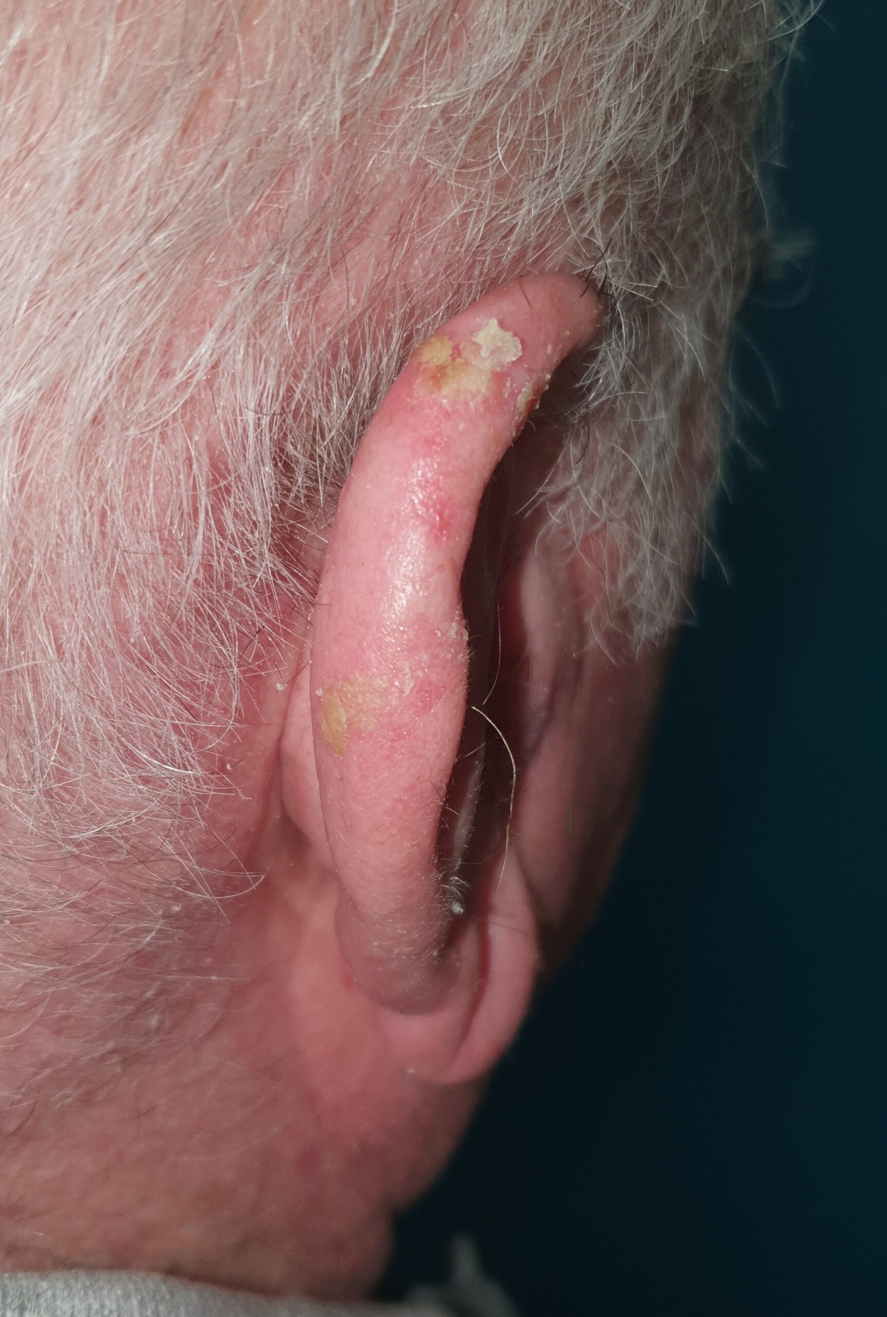 Maurice, 74 ans, consulte du fait de la présence de lésions multiples croûteuses au niveau de ses deux oreilles (Fig. 3). Il explique que ces formations se sont développées lentement, mais deviennent actuellement prépondérantes, et ses amis lui ont expliqué qu’il pouvait s’agir d’un cancer cutané. Malgré son âge, Maurice pratique très régulièrement de l’aviron, et il affectionne particulièrement les compétitions de ce sport. Il nous explique s’entraîner très régulièrement, quelles que soient les conditions atmosphériques.