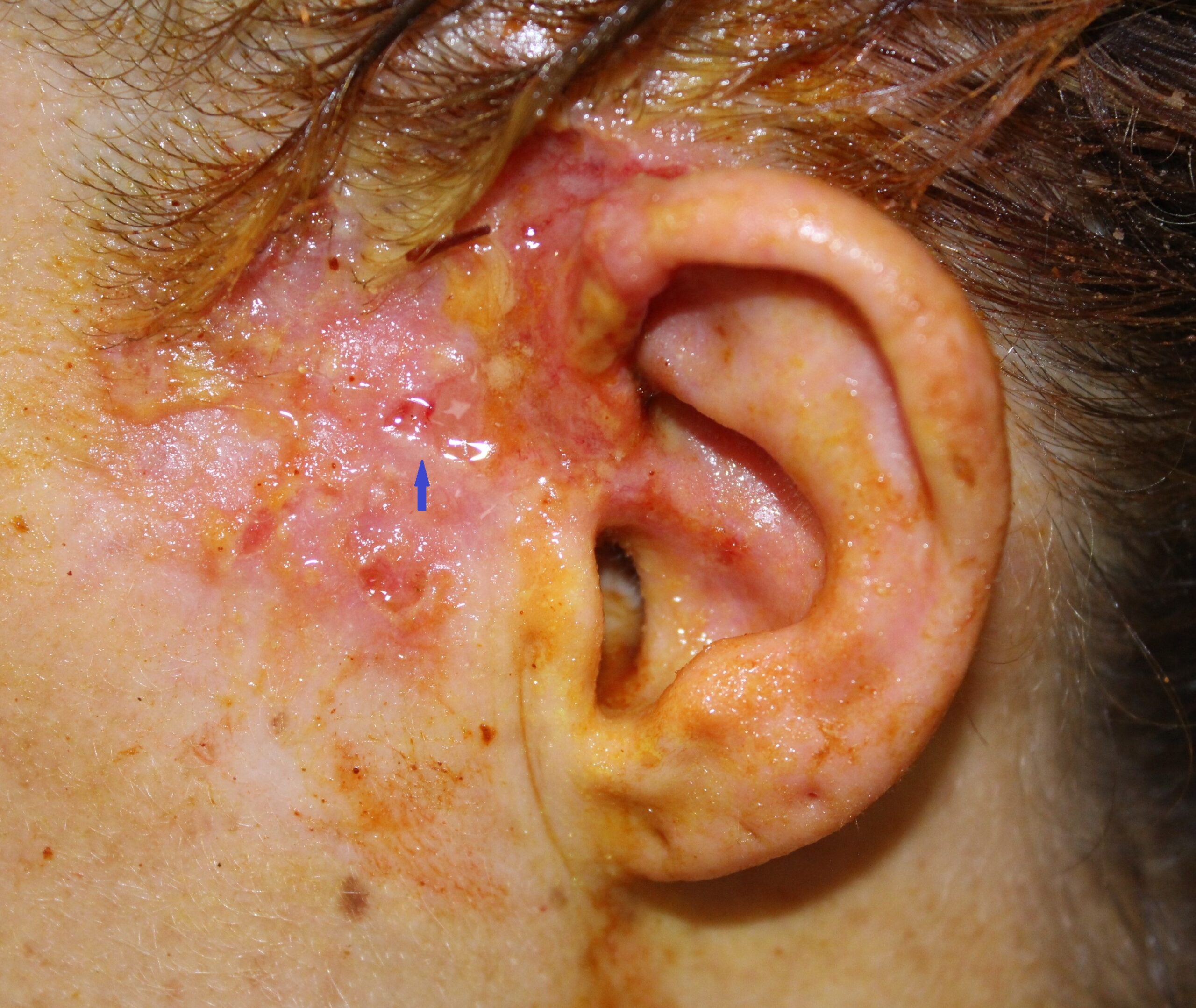 Les lésions observées sont centrées sur les zones péri-orificielles (nez, bouche, cuir chevelu, oreilles), mais aussi au niveau des bras et des jambes.
