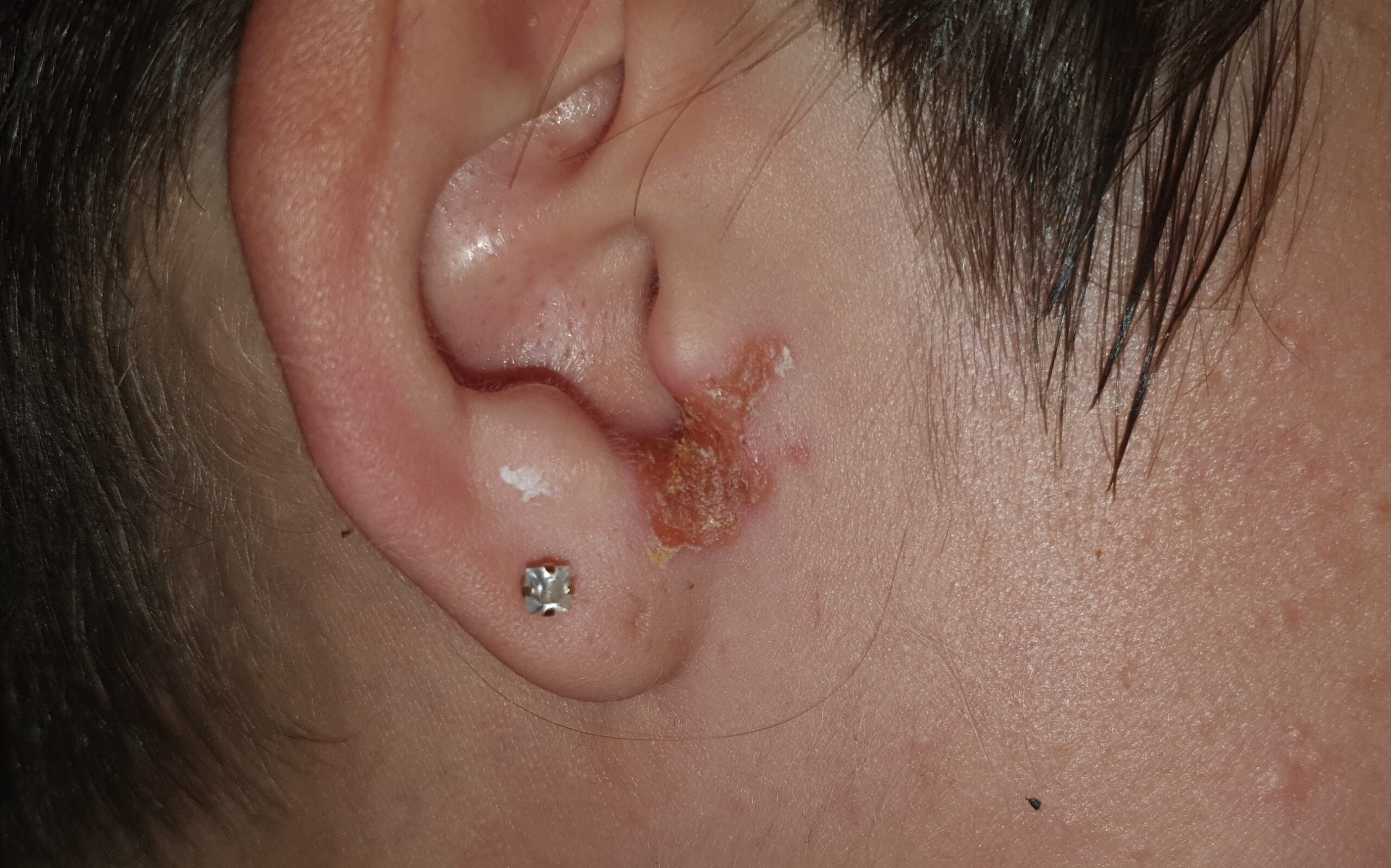 Aurélie, 25 ans, consulte pour des croûtes de couleur jaune au niveau du lobe de son oreille droite (Fig. 7). Elle ne comprend pas trop les raisons de cette lésion, car elle nous explique être très propre, et son entourage ne cesse de lui répéter que cette formation est en rapport avec un défaut d’hygiène. Par ailleurs, cette patiente nous raconte qu’elle s’est inscrite à un club de chakuriki (sport de combat se rapprochant de la boxe) il y a 3 mois de cela. Depuis cette adhésion, elle observe régulièrement des plaies au niveau des mains, mais aussi du visage du fait de l’agressivité de cette pratique sportive.