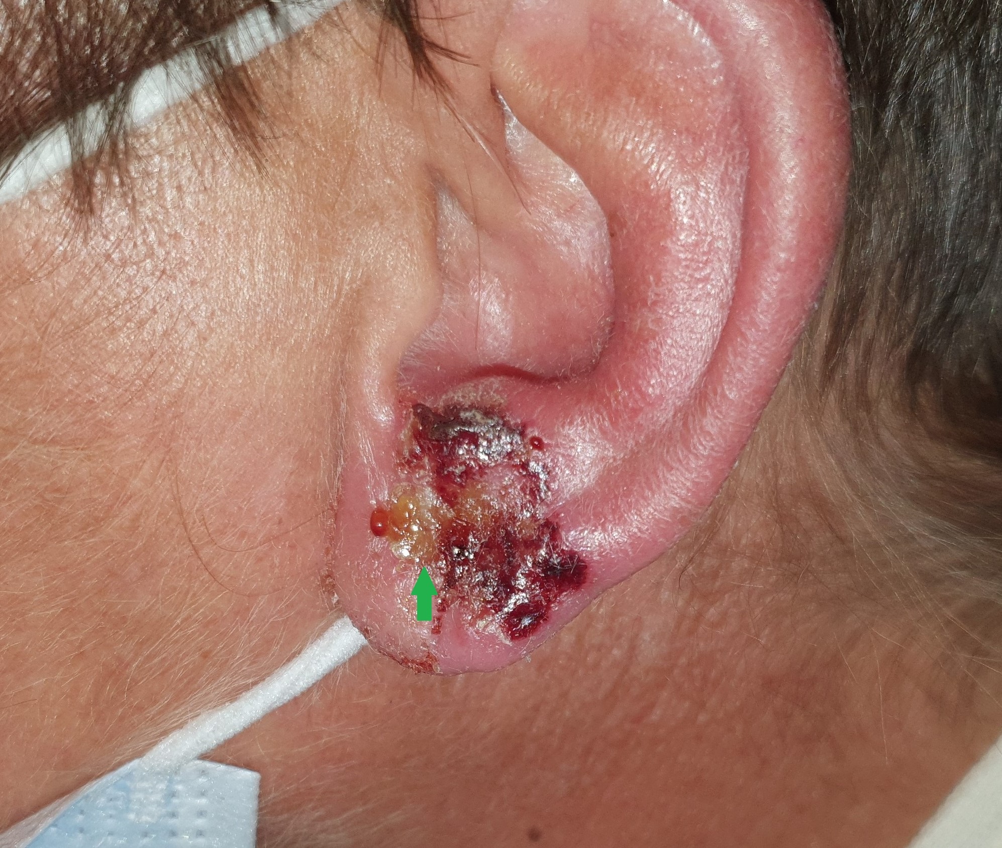 - Nous pouvons également objectiver, chez certains patients, un autre type de néoplasie : le carcinome basocellulaire (Fig. 6), une affection maligne cutanée le plus fréquente. Elle concerne les kératinocytes de la couche basale. L’atteinte des oreilles est due, tout comme dans le cas de la kératose actinique, à une photoexposition intense. Cliniquement, on retient la présence le plus souvent d’une lésion à type de perle. Le traitement est superposable à celui du carcinome épidermoïde, sachant cependant que son potentiel métastatique est quasi nul.